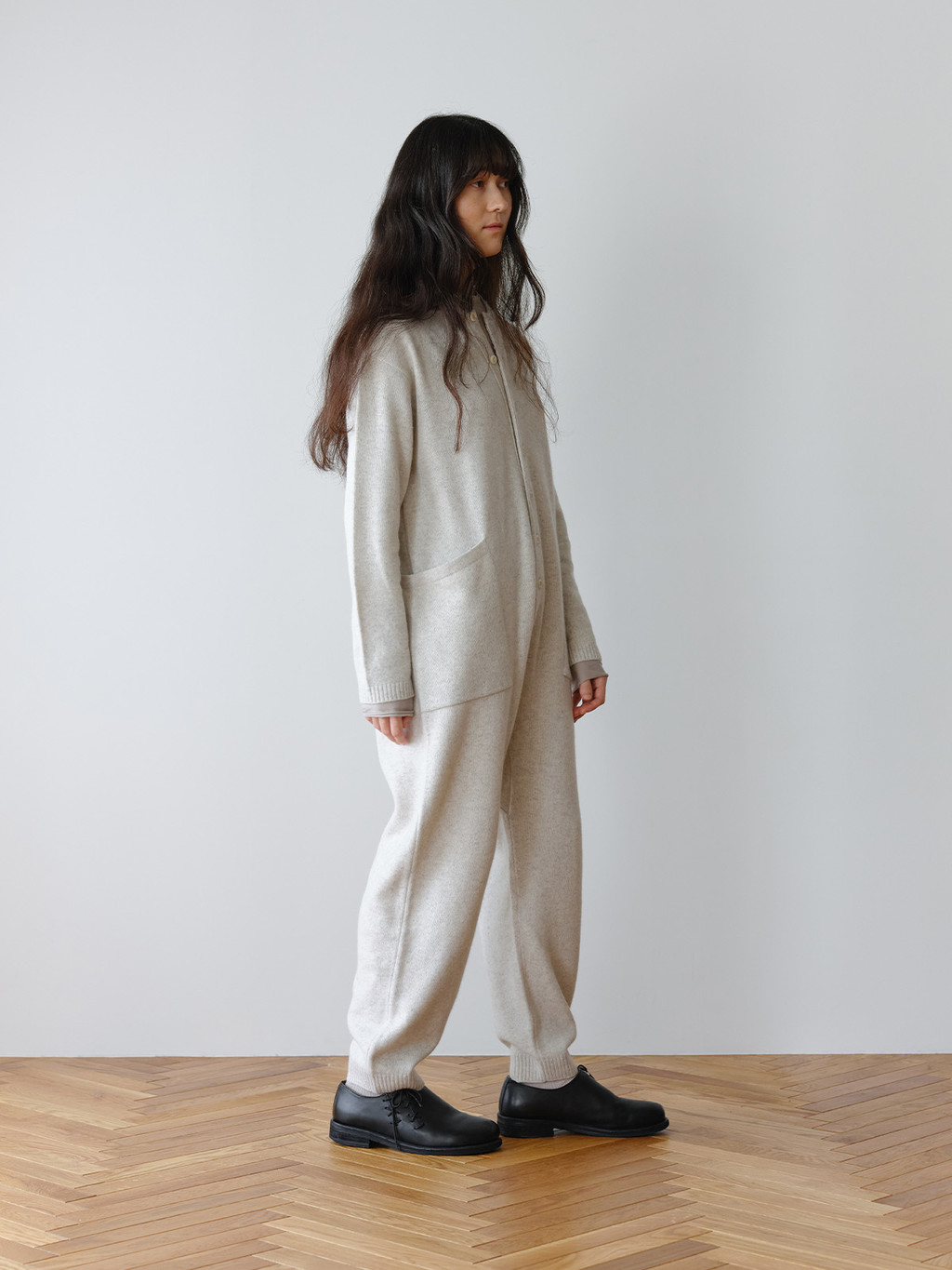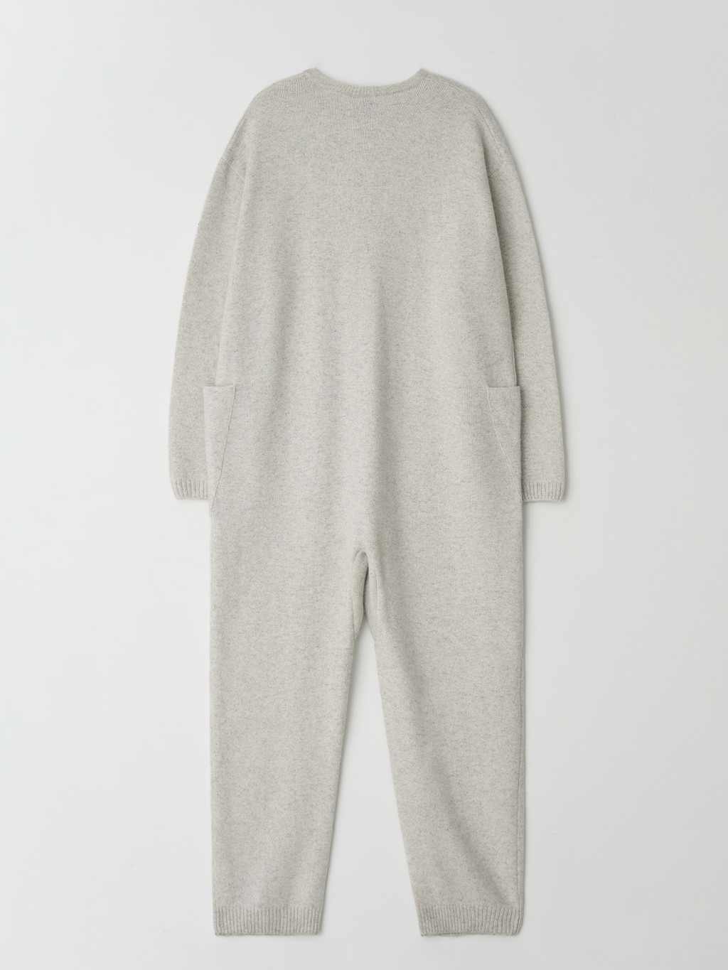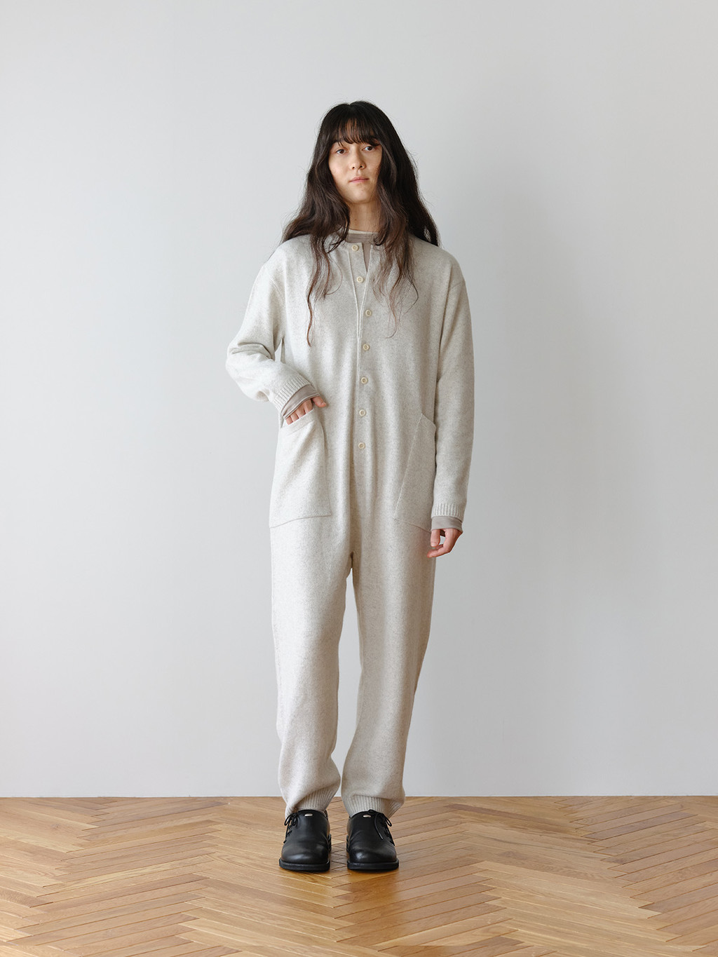 This Space Suit from NOT ON EARTH is knitted from a luxurious raccoon wool blend, offering a relaxed and natural silhouette with a comfortable, high-end feel. The top and bottom are connected, creating a design reminiscent of an astronaut's suit, and the loose, straight fit ensures a comfortable wear. The ribbed detailing at the sleeve cuffs and pant hems adds a refined touch, enhancing the overall finish. The raccoon wool blend fabric provides a soft, luxurious texture, making this item not only stylish but also incredibly warm. With excellent insulation, this space suit can easily be styled with just an outerwear piece during the winter, completing a chic look.