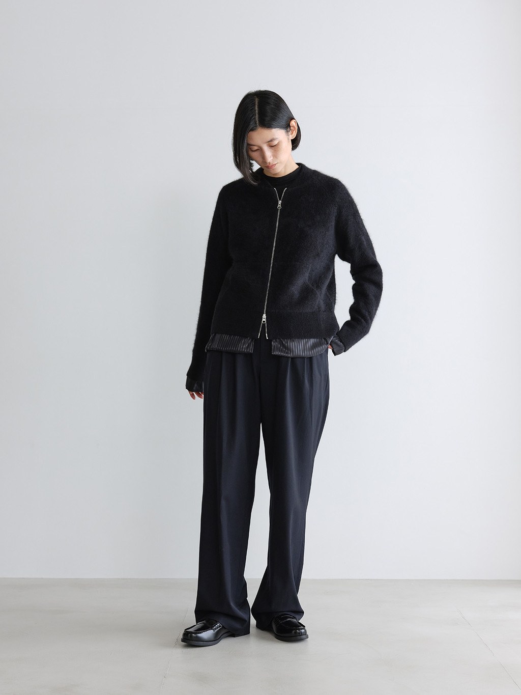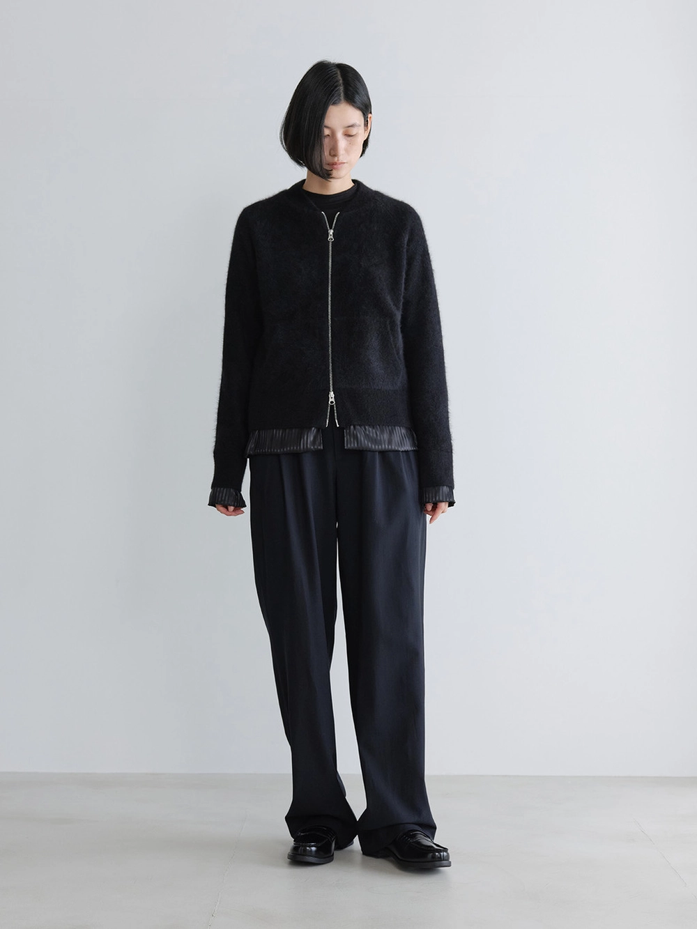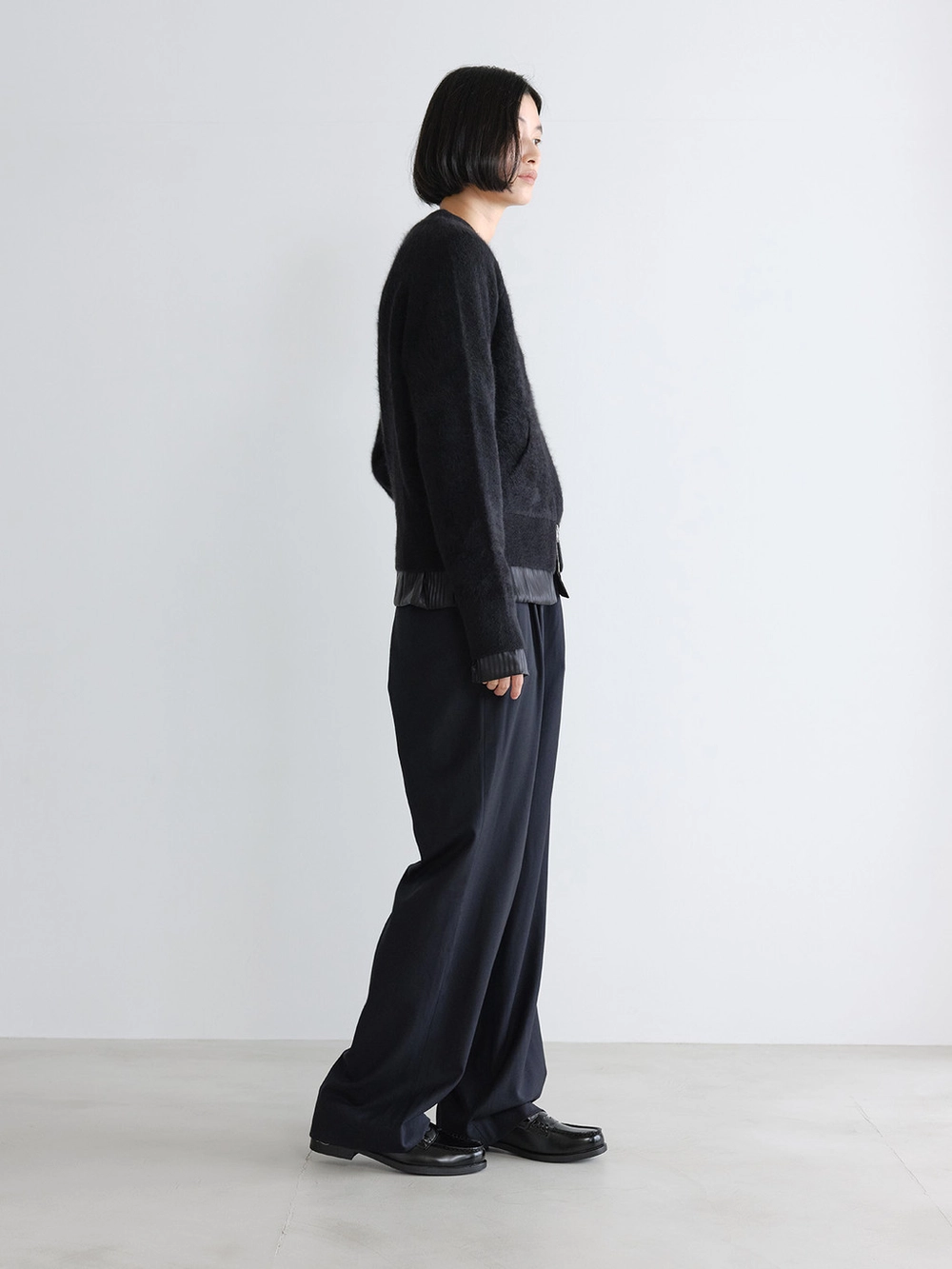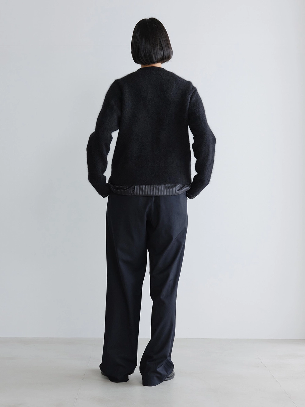 At the heart of the NOT ON EARTH Laboratory is a large training center in the form of a gym. The first thing that catches your eye upon entering is the well-maintained wood floor. Trainers usually wear active and comfortable clothing, and sometimes opt for a relaxed t-shirt and pants, often going barefoot. People began calling these pants the Floor Pants because they complement the training center’s floor so well. Designed for trainers to move comfortably, the Floor Pants offer a relaxed fit that can be worn with ease. With just the right amount of sheen, these pants are truly special.