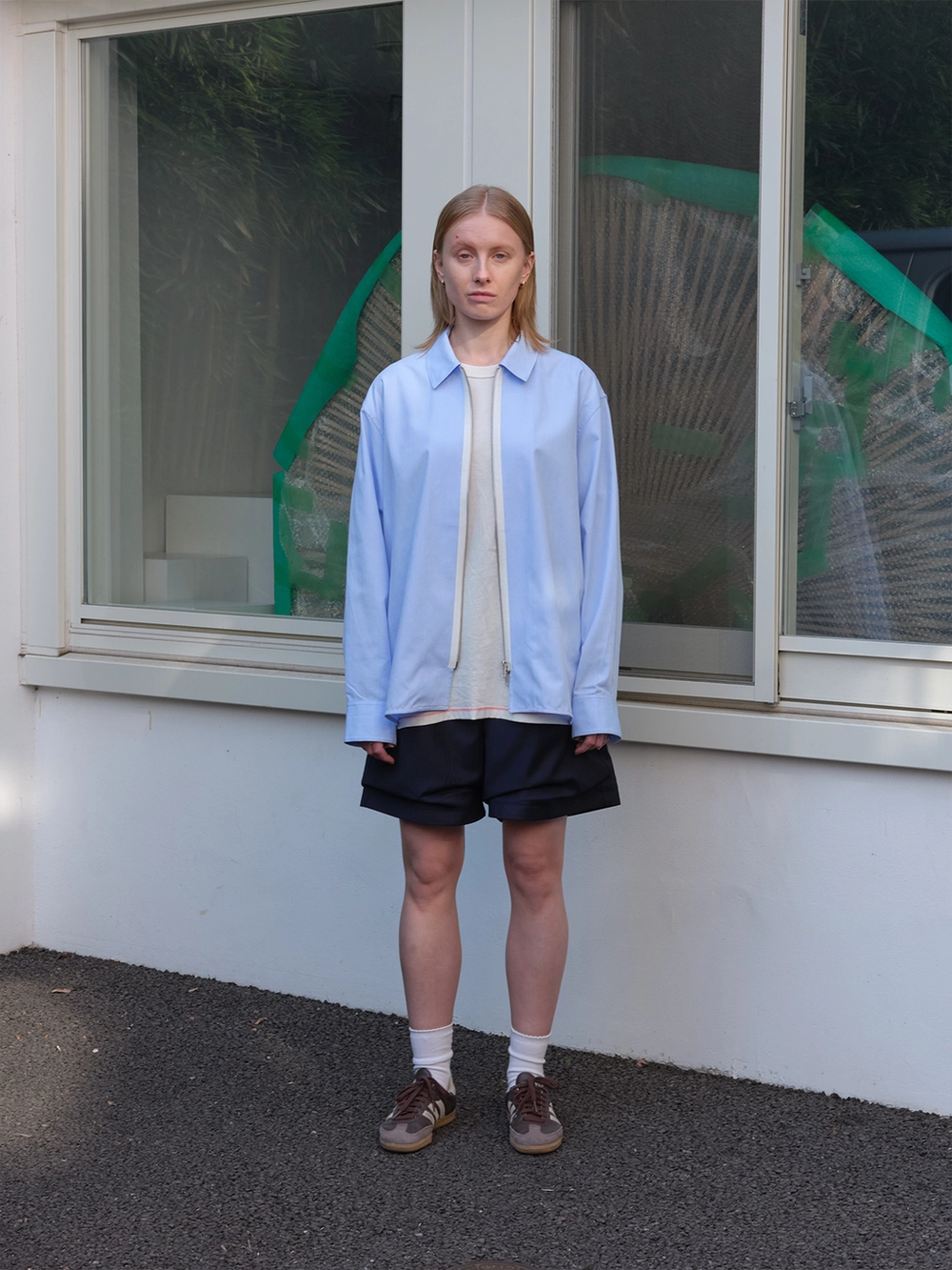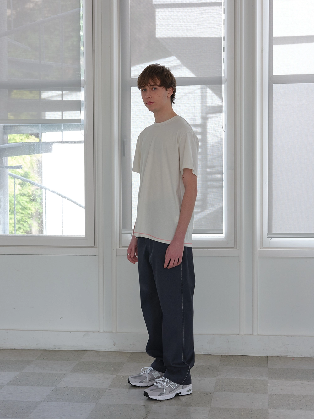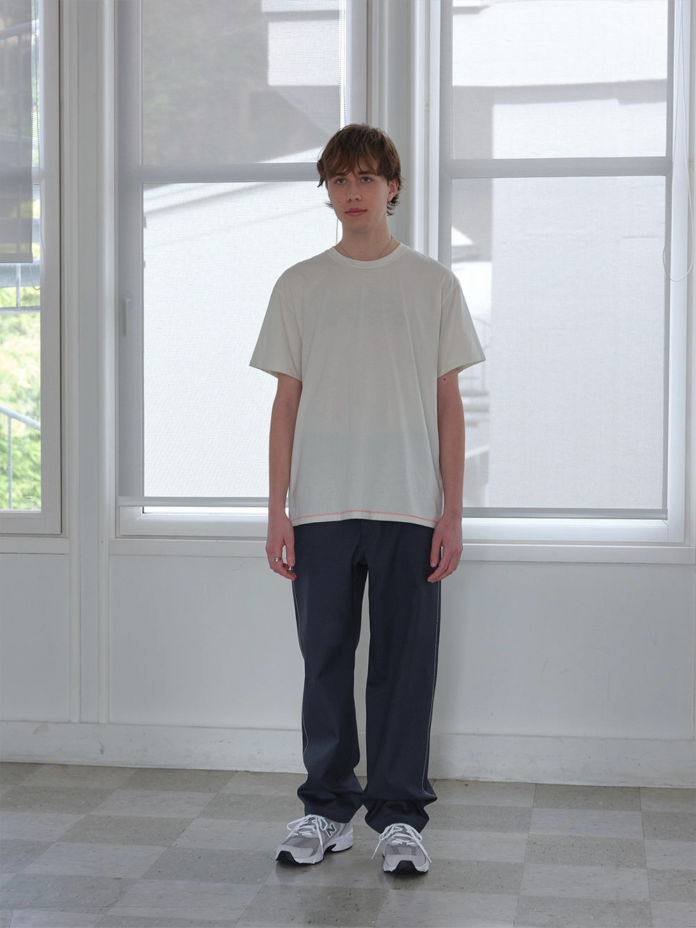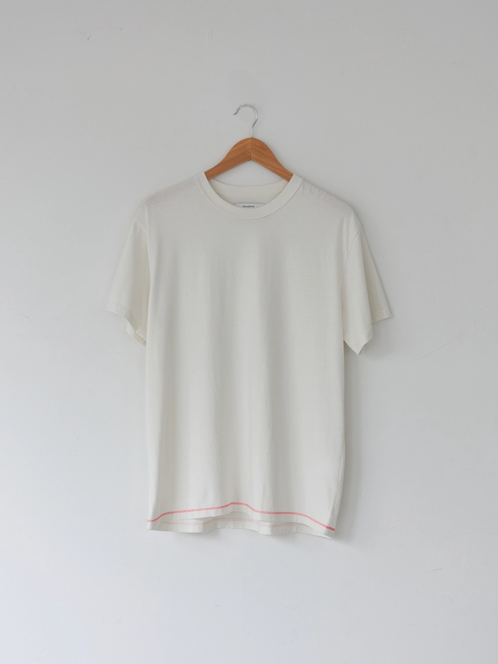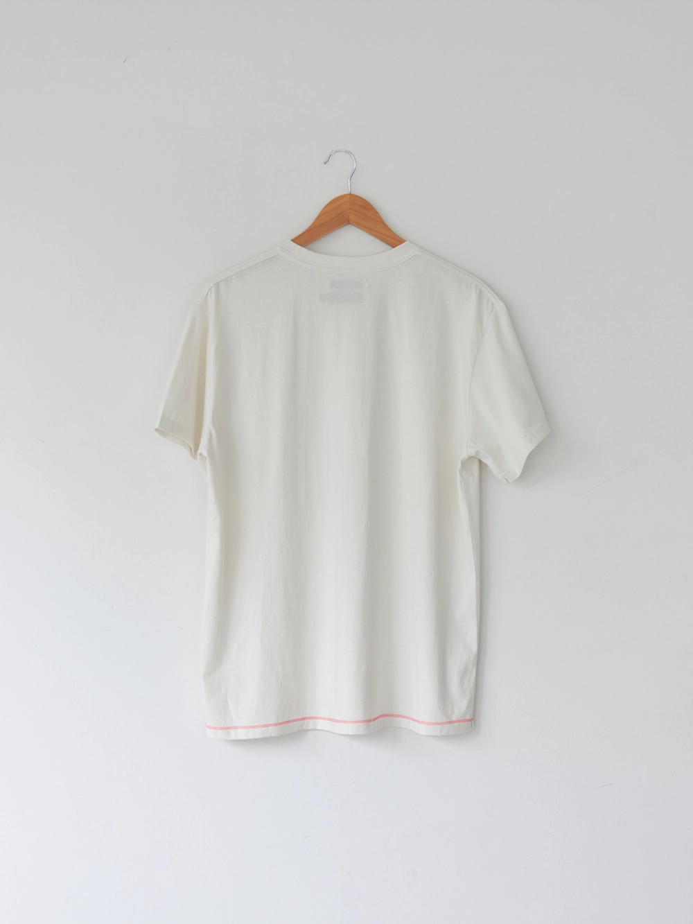 At the heart of the NOT ON EARTH Laboratory is a large training center in the form of a gym. The most striking feature here is the glossy wood floor. The trainers who work in the training center typically wear activewear, but sometimes they opt for a comfortable t-shirt and pants, often going barefoot. People began calling this t-shirt the Floor T-shirt, as it complements the training center’s floor so well. Designed with a slightly shorter length and a wider fit for ease of movement, this t-shirt is made from a structured pattern that gives it a three-dimensional silhouette. Delicate topstitching is applied to all the lines, including the darts on both sides of the back neck and the seams on the sides. It is made from a soft, cool-touch cotton fabric.