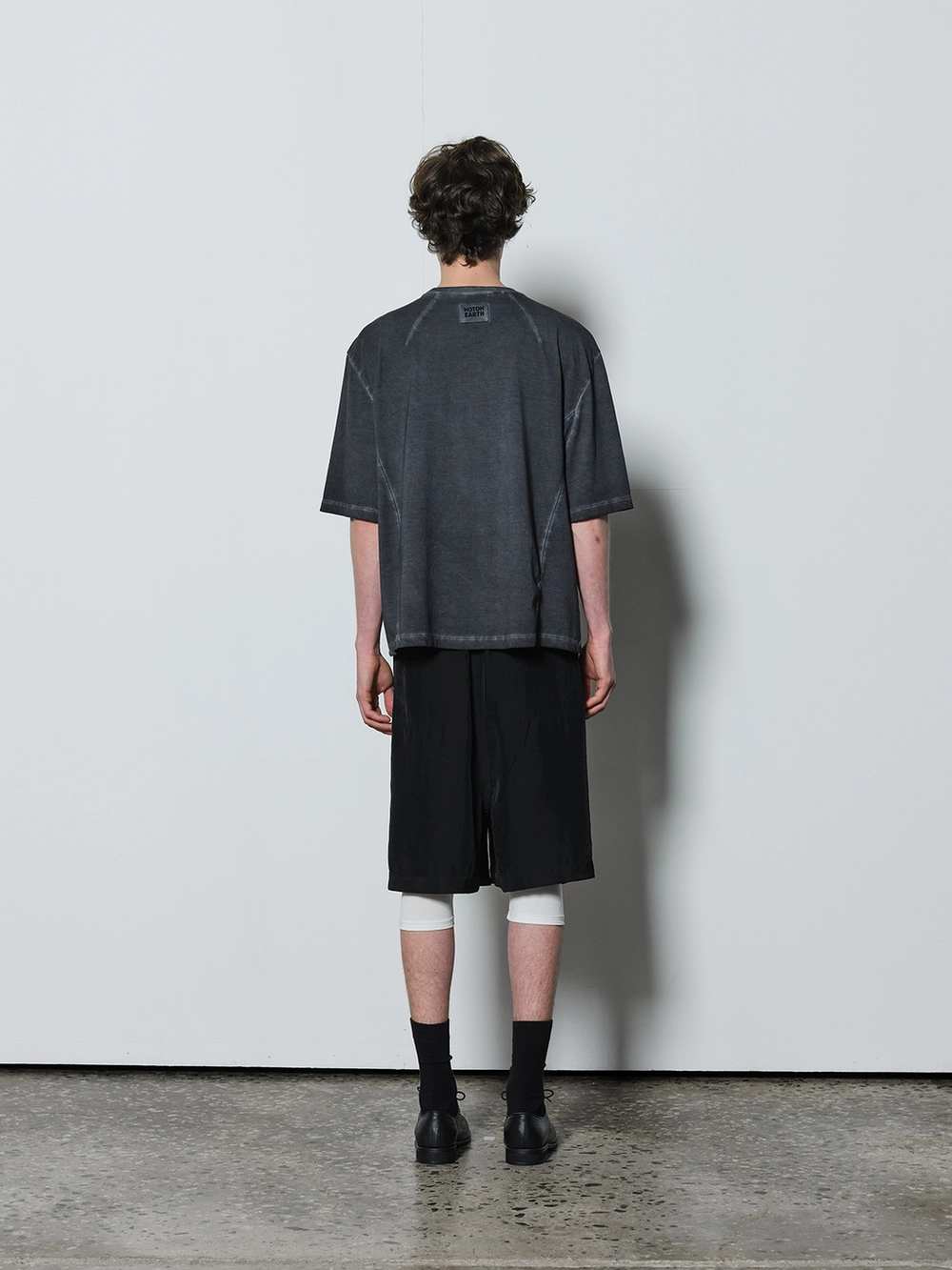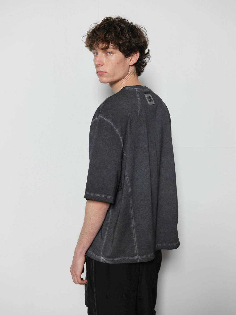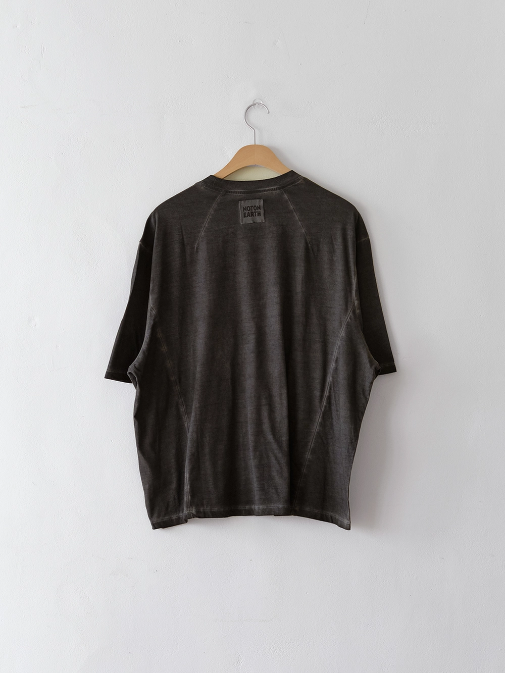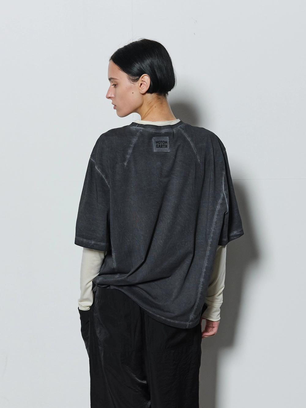 At the heart of the NOT ON EARTH Laboratory is a large training center in the form of a gym. The most striking feature here is the glossy wood floor. The trainers who work in the training center typically wear activewear, but sometimes they opt for a comfortable t-shirt and pants, often going barefoot. People began calling this t-shirt the Floor T-shirt, as it complements the training center’s floor so well. Designed with a slightly shorter length and a wider fit for ease of movement, this t-shirt is made from a structured pattern that gives it a three-dimensional silhouette. Delicate topstitching is applied to all the lines, including the darts on both sides of the back neck and the seams on the sides. It is made from a soft, cool-touch cotton fabric.