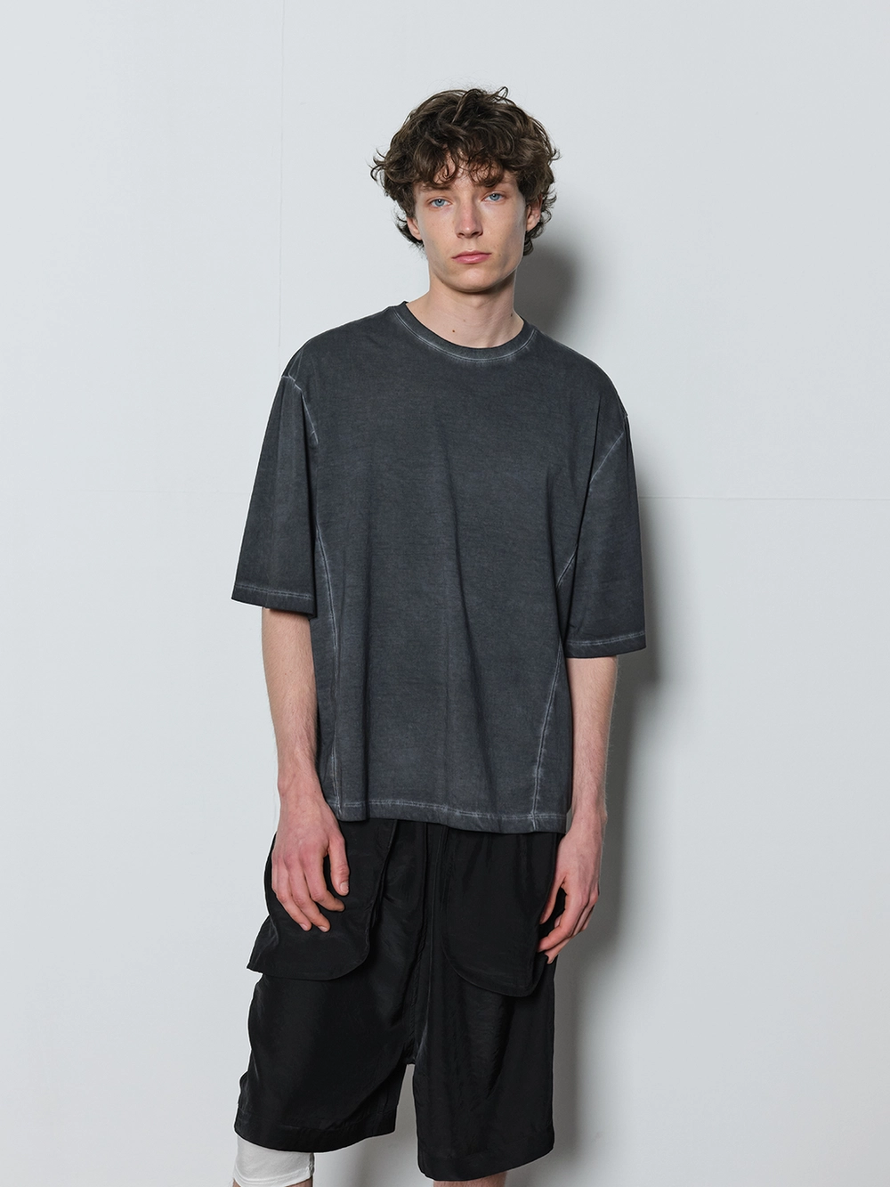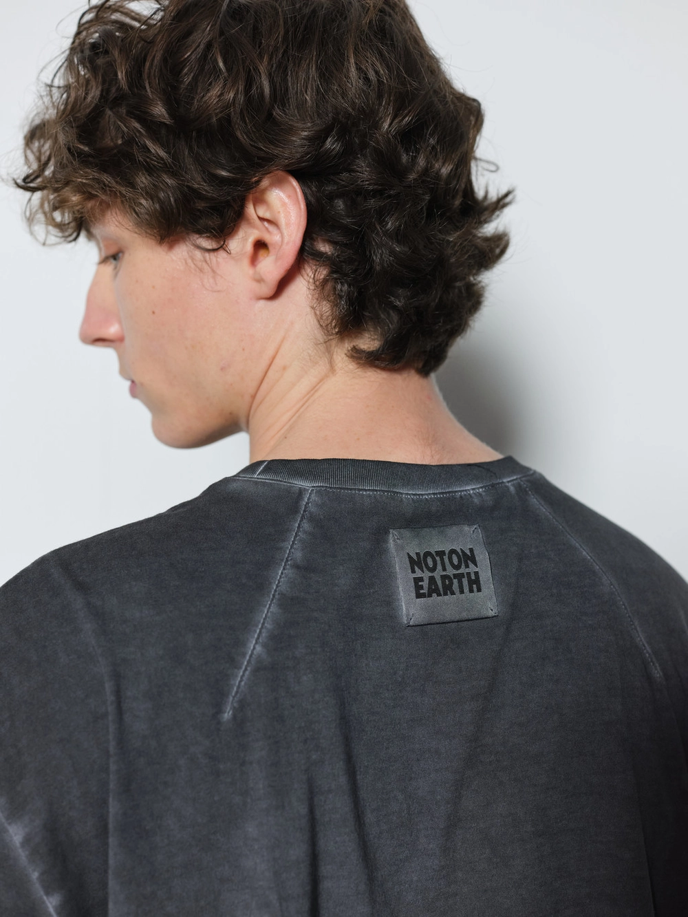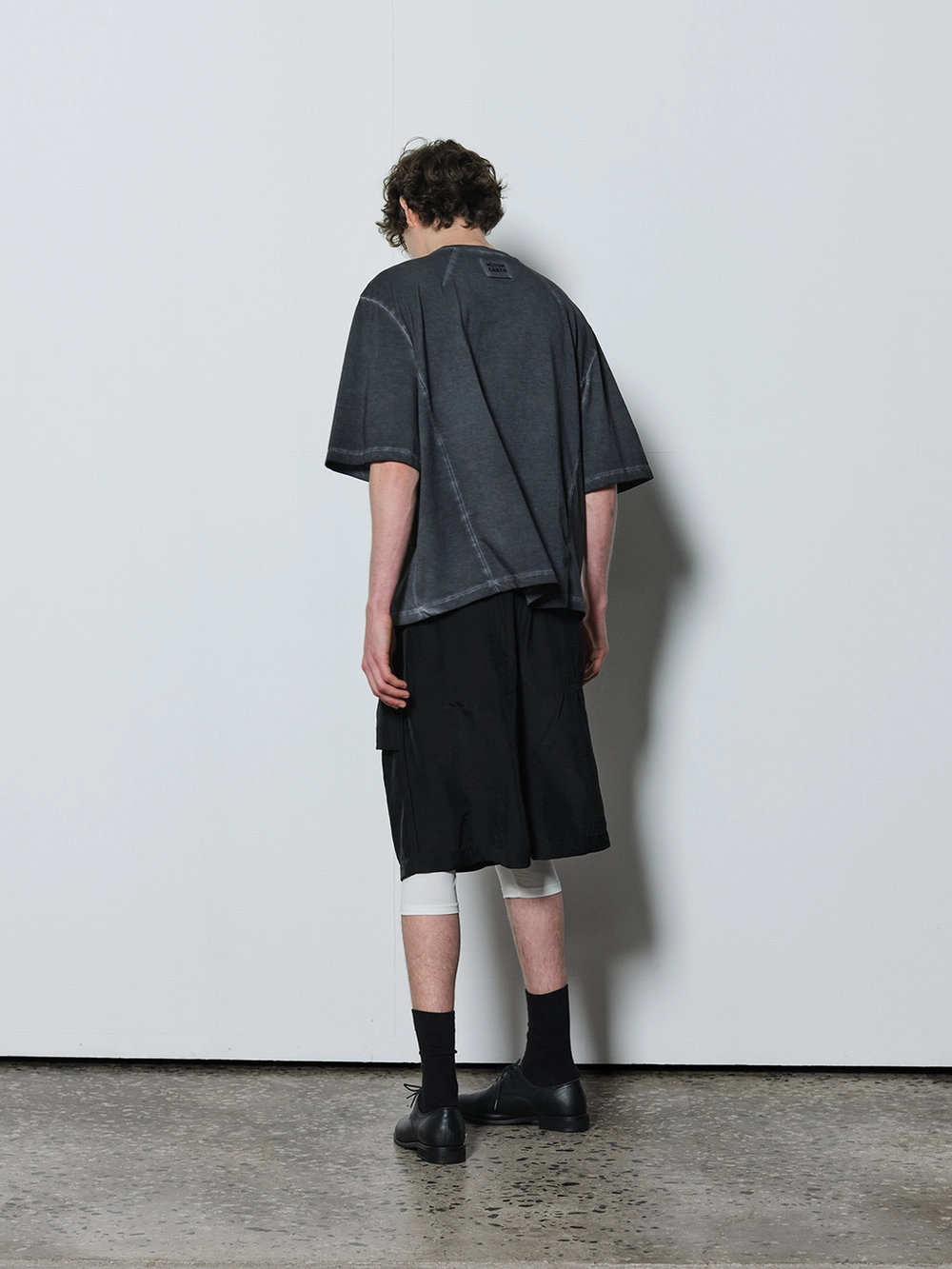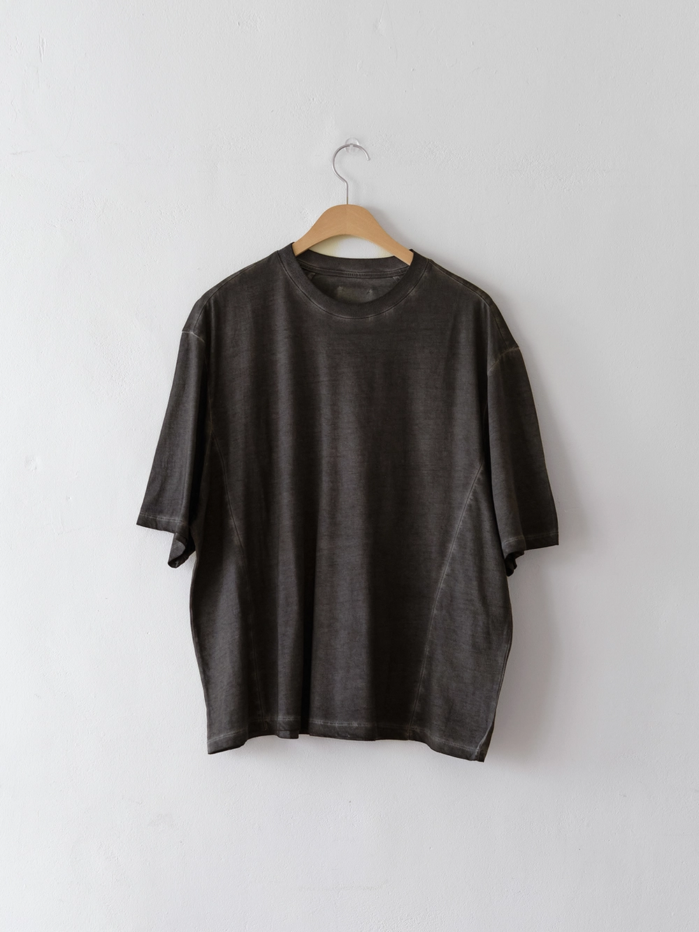 At the heart of the NOT ON EARTH Laboratory is a large training center in the form of a gym. The most striking feature here is the glossy wood floor. The trainers who work in the training center typically wear activewear, but sometimes they opt for a comfortable t-shirt and pants, often going barefoot. People began calling this t-shirt the Floor T-shirt, as it complements the training center’s floor so well. Designed with a slightly shorter length and a wider fit for ease of movement, this t-shirt is made from a structured pattern that gives it a three-dimensional silhouette. Delicate topstitching is applied to all the lines, including the darts on both sides of the back neck and the seams on the sides. It is made from a soft, cool-touch cotton fabric.