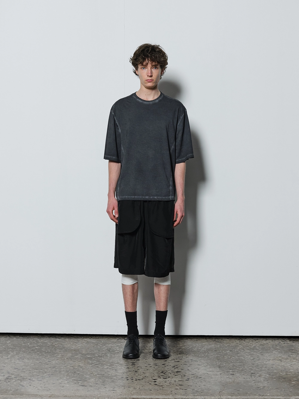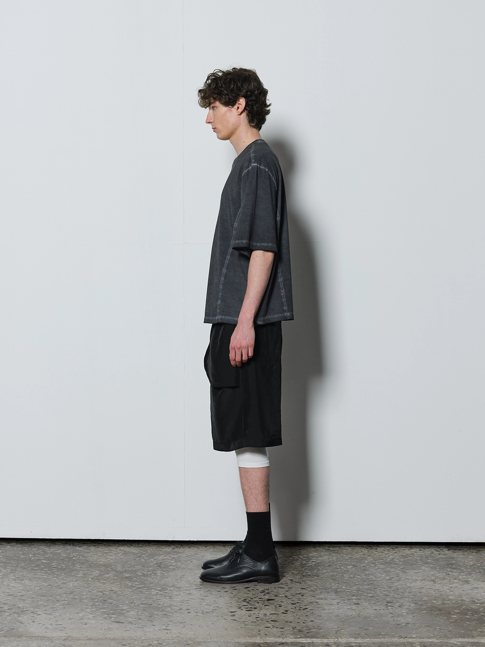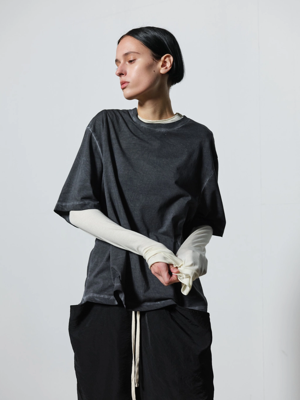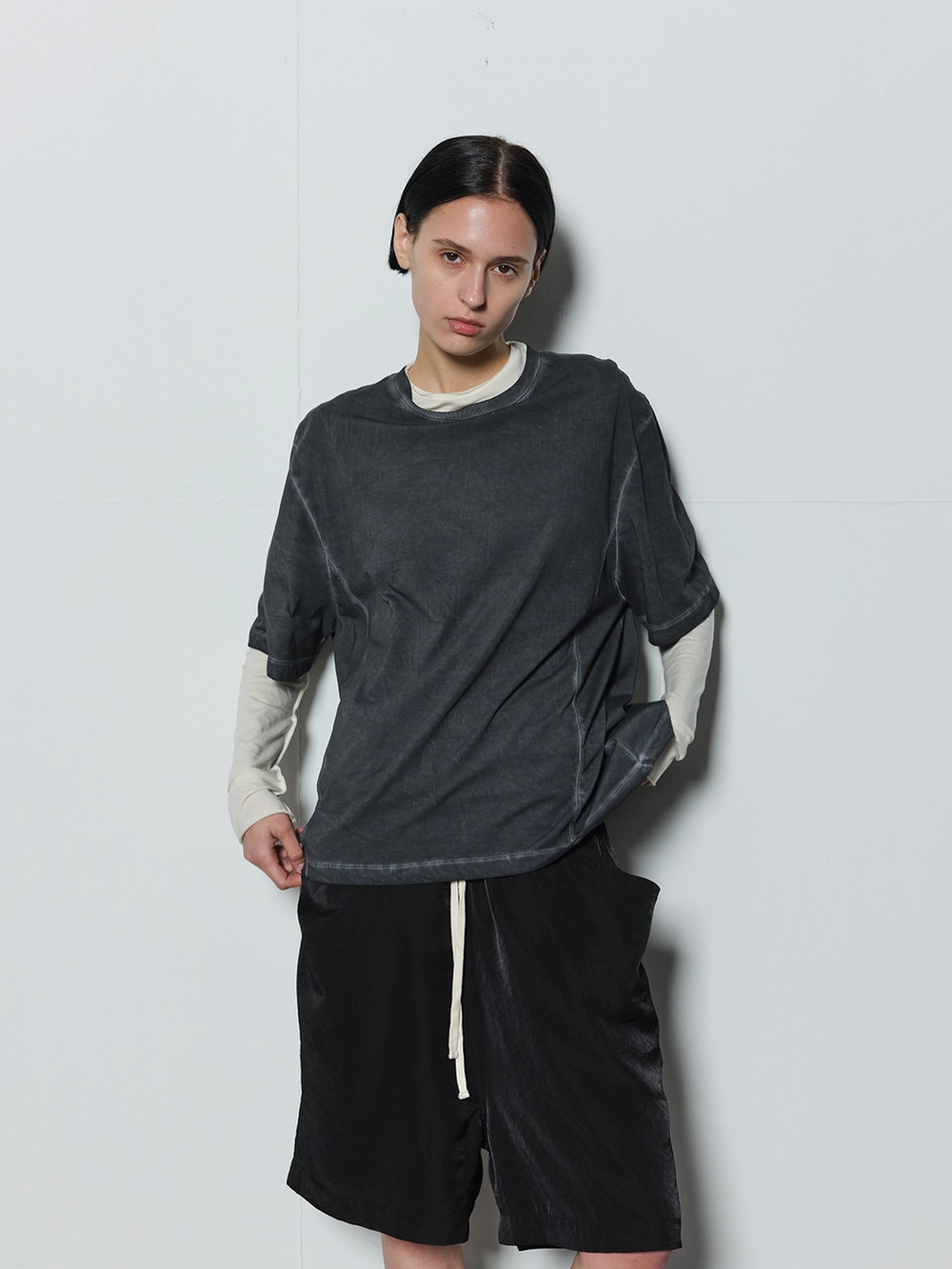 At the heart of the NOT ON EARTH Laboratory is a large training center in the form of a gym. The most striking feature here is the glossy wood floor. The trainers who work in the training center typically wear activewear, but sometimes they opt for a comfortable t-shirt and pants, often going barefoot. People began calling this t-shirt the Floor T-shirt, as it complements the training center’s floor so well. Designed with a slightly shorter length and a wider fit for ease of movement, this t-shirt is made from a structured pattern that gives it a three-dimensional silhouette. Delicate topstitching is applied to all the lines, including the darts on both sides of the back neck and the seams on the sides. It is made from a soft, cool-touch cotton fabric.