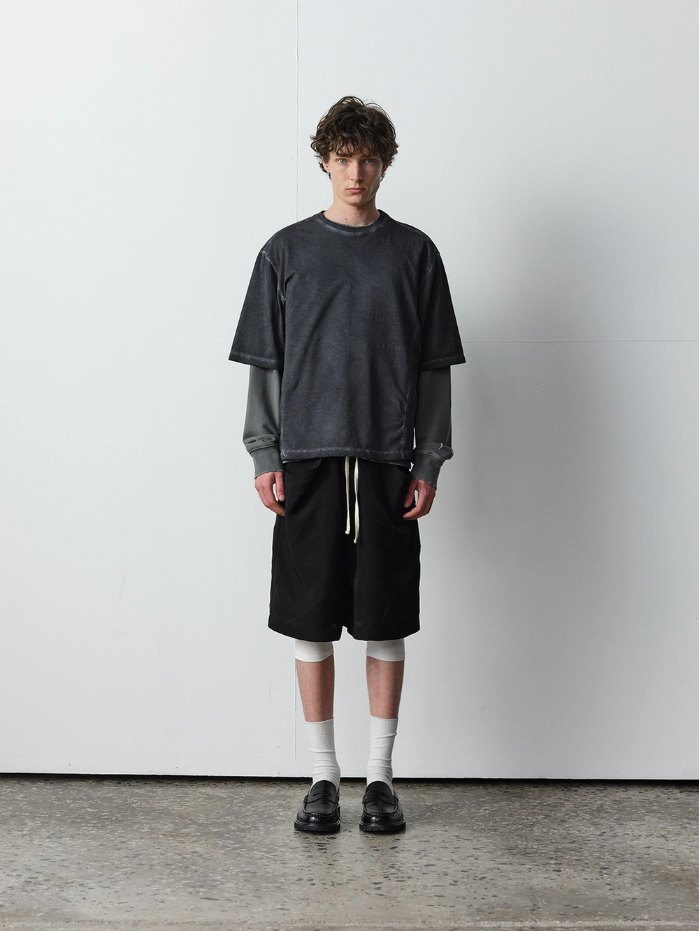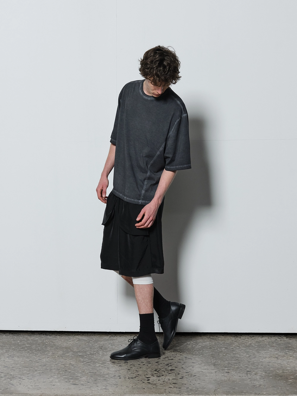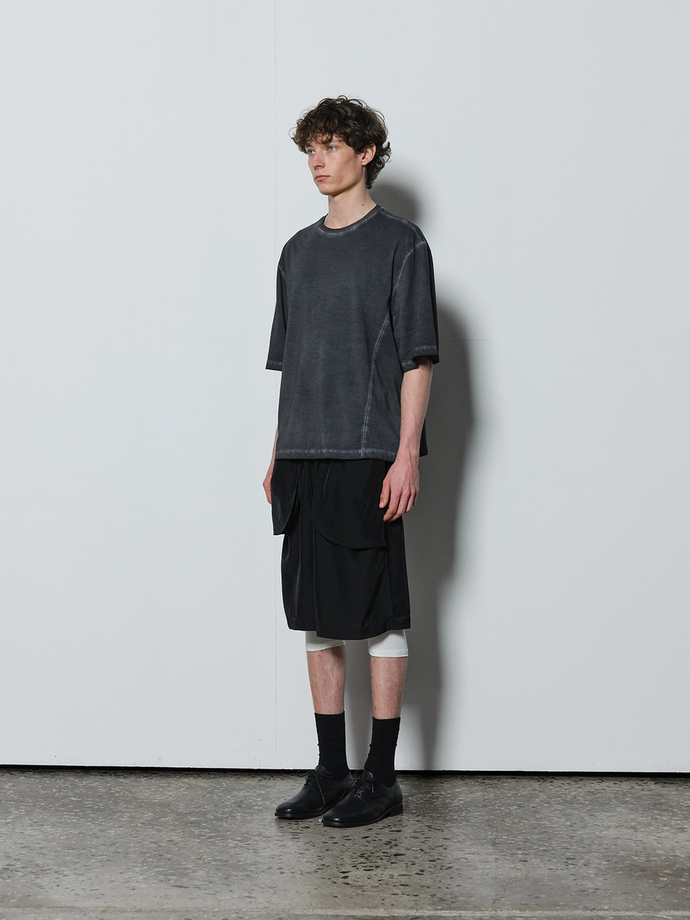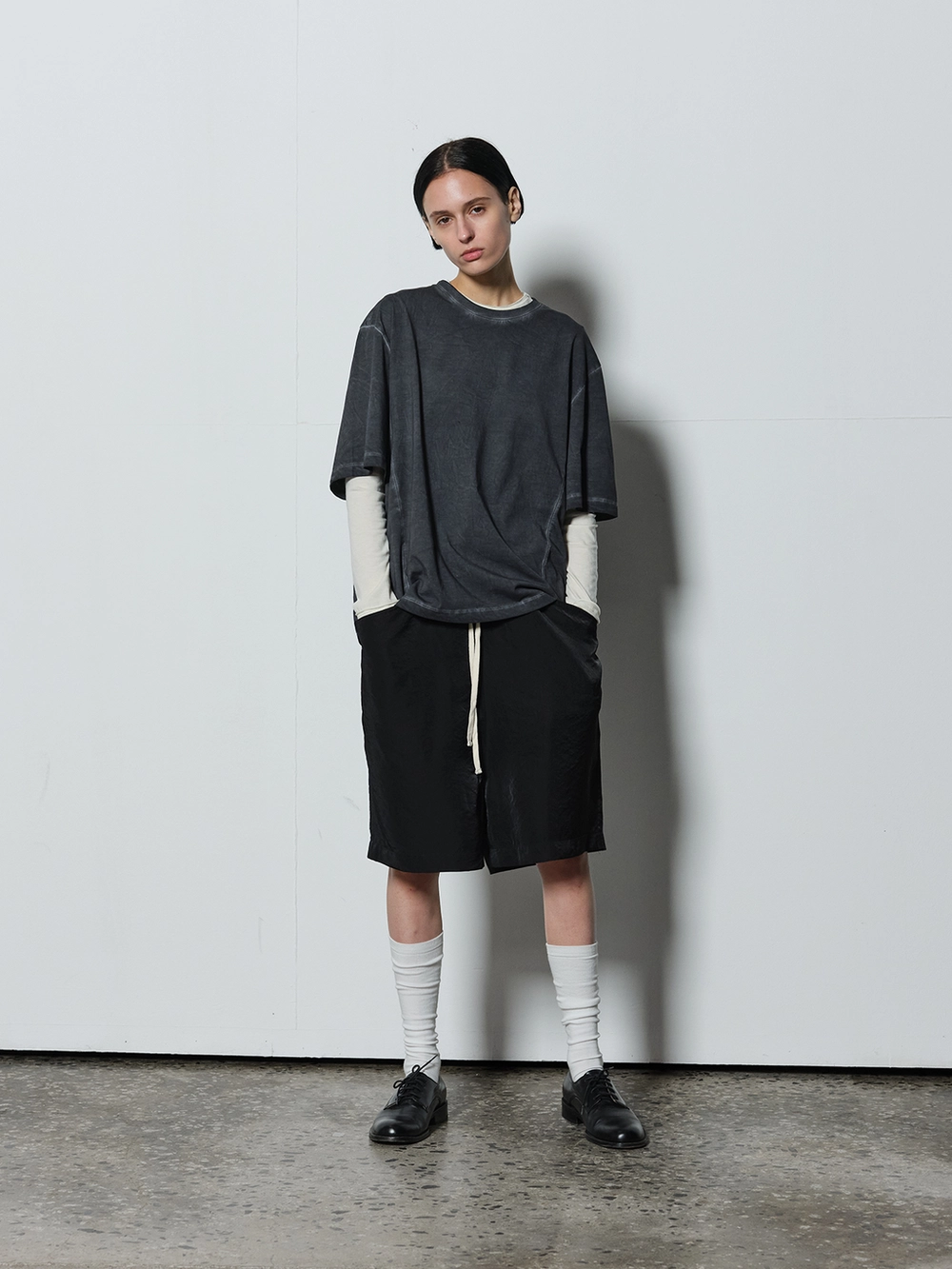 At the heart of the NOT ON EARTH Laboratory is a large training center in the form of a gym. The most striking feature here is the glossy wood floor. The trainers who work in the training center typically wear activewear, but sometimes they opt for a comfortable t-shirt and pants, often going barefoot. People began calling this t-shirt the Floor T-shirt, as it complements the training center’s floor so well. Designed with a slightly shorter length and a wider fit for ease of movement, this t-shirt is made from a structured pattern that gives it a three-dimensional silhouette. Delicate topstitching is applied to all the lines, including the darts on both sides of the back neck and the seams on the sides. It is made from a soft, cool-touch cotton fabric.
